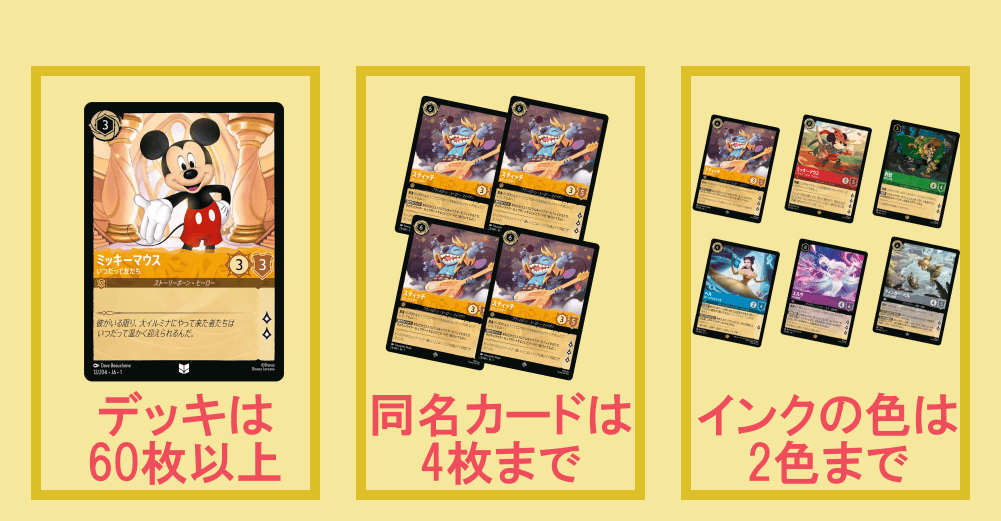 キャラクター・アイテム・アクションに関わらず同名カードは4枚までとなります。ただし、キャラクターカードに関しては、<<スティッチ お気楽サーファー>>と<<スティッチ ロックスター>>のようにバリエーション名が違えばそれぞれ4枚まで構築することが可能です!