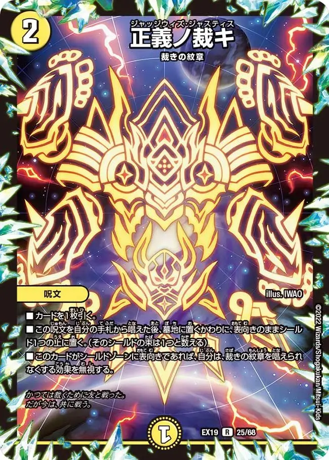 このカードがシールドゾーンに表向きであれば、自分は、裁きの紋章を唱えられなくする効果を無視するという優秀な能力をもつ呪文です。この呪文を自分の手札から唱えた後、墓地に置くかわりに、表向きのままシールド1つの上に置く便利な能力をもち、シールドゾーンでの能力を使うために役立ちます。