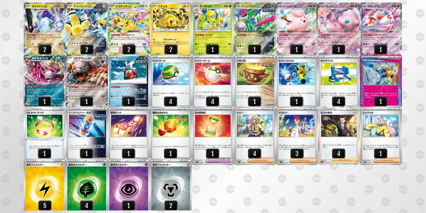 自分の山札から「基本草エネルギー」と「基本雷エネルギー」をそれぞれ2枚まで選び、自分のポケモンに好きなようにつける便利なワザをもつポケモンです。